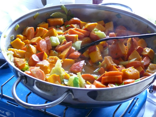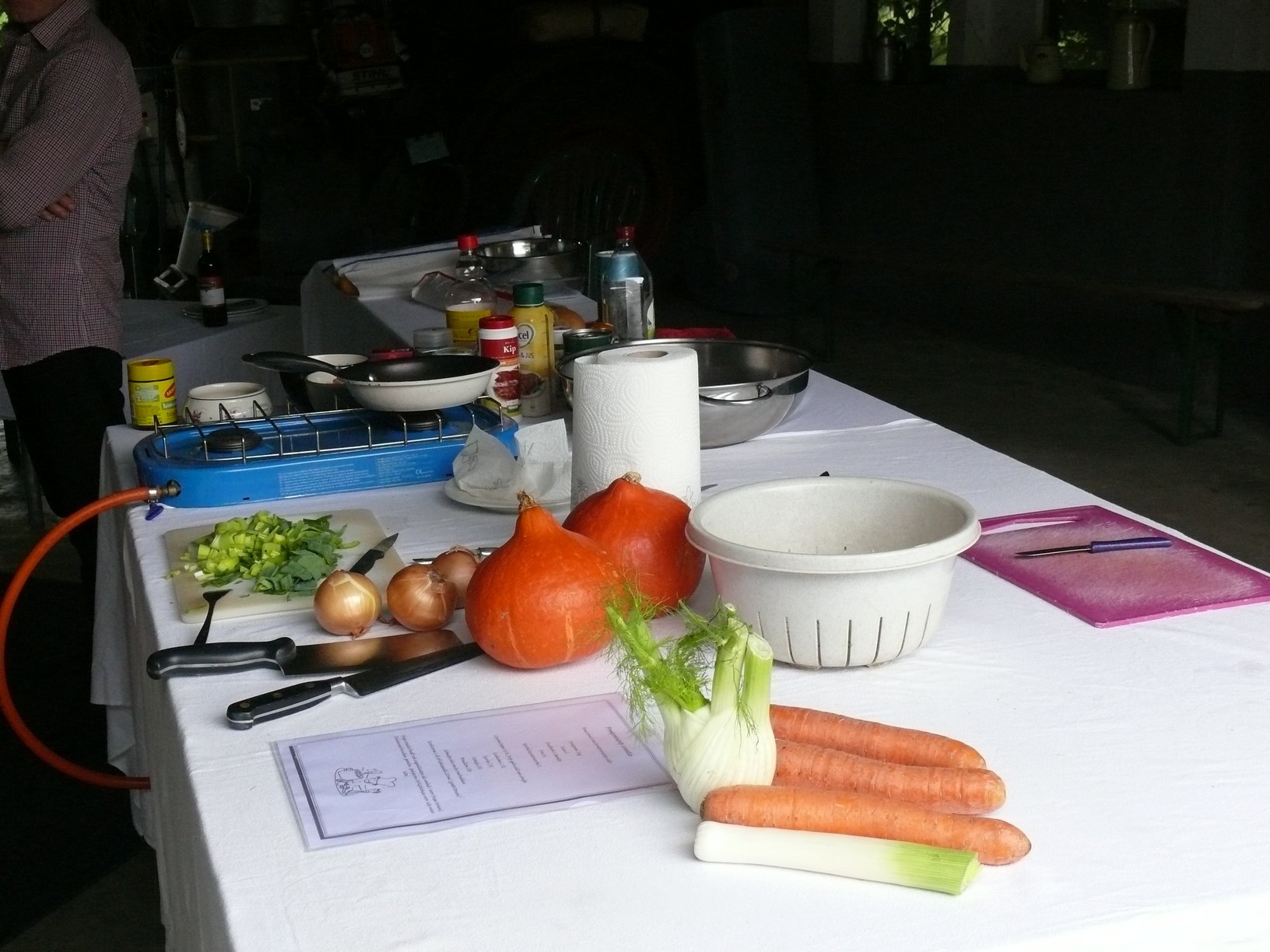 Op de geïmproviseerde keukentafel in het bijgebouw had Joop de ingrediënten al klaargelegd, zoals een tweetal kleine pompoenen (Hokkaido?), winterwortelen, uien, prei, venkel en knoflook.