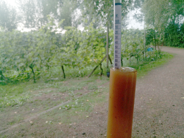 Het voordeel deze zomer is dat er al snel veel suikers zijn gevormd. Uiteindelijk konden we net voor de oogst 94 graden Oechsele meten (een densiteit/soortelijk gewicht van 1094). Na de persing, toen alles bij elkaar in het vat zat is nogmaals gemeten en kwam er 97 graden Oechsele uit de bus. Daar was deze wijnboer heel tevreden mee.