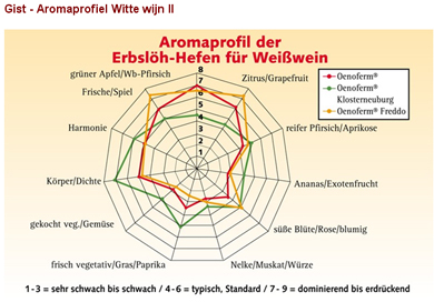 Waarom deze gisten genoemd? Dit om te voorkomen dat de indruk wordt gewekt dat er zoiets bestaat als de enige te gebruiken gist, de enige goede gist. Dat is niet zo. Persoonlijke smaak en voorkeur spelen daarvoor een veel te grote rol. En dat is maar goed ook. We lopen met uw goedvinden even door de smaakrozen, en laten u dan een grafiek zien waarop het resultaat van drie verschillende gistvariëteiten met gebruik van hetzelfde sap in onderlinge vergelijking is uitgedrukt. Dat heeft Erbslöh voor ons gedaan.