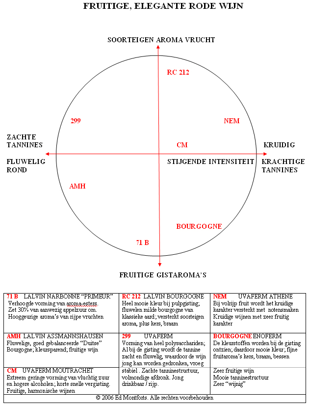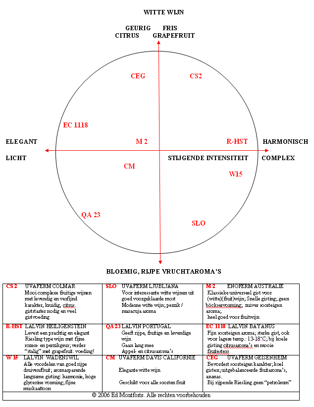 Kunnen we dan kiezen? Jazeker. Er zijn enorm veel gistsoorten in de handel, elk met hun eigen karakteristiek. We kunnen dus kiezen welk karakter onze wijn gaat krijgen door de variëteit van de gist te kiezen. Daarvoor gebruiken we een zogenaamde “smaakroos”. Een aantal daarvan hangen er achter ons. Ik zal uitleggen hoe ze gelezen moeten worden. Overigens heb ik voor mijn voorbeelden een beperkt aantal van de vele gisten uitgekozen, die normaliter in Nederland niet verkrijgbaar zijn. Wel in het buitenland. In pakken van 500 gram. Iets teveel voor de gemiddelde amateur. Omdat ik veel met gisten heb geëxperimenteerd (dat doe ik nog steeds) heb ik een aantal gisten opnieuw vacuüm verpakt in hoeveelheden van 10 gram. Die gist houdt het jarenlang in de koelkast of oneindig in de diepvries uit en zo kunnen de leden van ons gilde er gebruik van maken. Ik breid het assortiment elk jaar uit. Voor euro 2,20 per pakje kunt u thuis controleren of ik heb staan liegen.